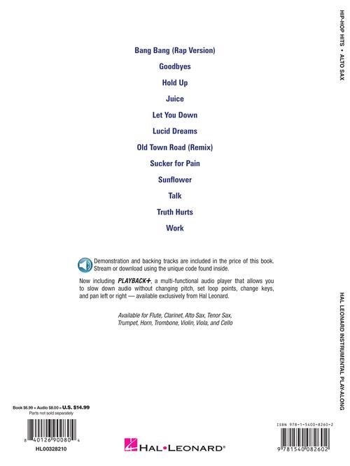 A dozen favorites from the hip-hop genre are included in this collection for beginning instrumentalists. It features online access to audio demonstration and backing tracks for download or streaming to help you hear how the song should sound then play along and sound like a pro! Songs include: Bang Bang (Rap Version) · Goodbyes · Hold Up · Juice · Let You Down · Lucid Dreams · Old Town Road (Remix) · Sucker for Pain · Sunflower · Talk · Truth Hurts · Work.