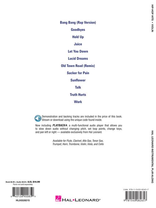 A dozen favorites from the hip-hop genre are included in this collection for beginning instrumentalists. It features online access to audio demonstration and backing tracks for download or streaming to help you hear how the song should sound then play along and sound like a pro! Songs include: Bang Bang (Rap Version) · Goodbyes · Hold Up · Juice · Let You Down · Lucid Dreams · Old Town Road (Remix) · Sucker for Pain · Sunflower · Talk · Truth Hurts · Work.