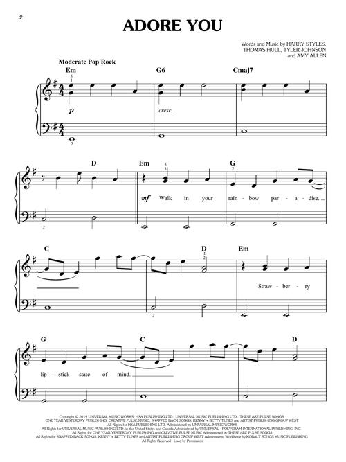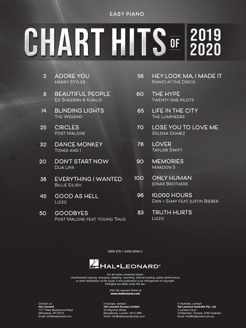 Beginning piano players can play their favorite songs of the moment with this easy piano collection of 18 songs, including: Beautiful People (Ed Sheeran feat. Khalid) · Circles (Post Malone) · Dance Monkey (Tones and I) · Everything I Wanted (Billie Eilish) · Lose You to Love Me (Selena Gomez) · Lover (Taylor Swift) · Memories (Maroon 5) · 10,000 Hours (Dan + Shay feat. Justin Bieber) · Truth Hurts (Lizzo) · and more.
