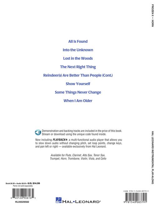 Solo arrangements for 8 tunes from the 2019 sequel to Disney's mega-hit movie Frozen are featured in this collection perfect for budding instrumentalists. It features online access to audio demonstration tracks for download or streaming to help you hear how the song should sound. Songs include: All Is Found · Into the Unknown · Lost in the Woods · The Next Right Thing · Reindeer(s) Are Better Than People (Cont.) · Show Yourself · Some Things Never Change · When I Am Older. Audio is accessed online using the unique code inside the book and can be streamed or downloaded. The audio files include PLAYBACK+, a multi-functional audio player that allows you to slow down audio without changing pitch, set loop points, change keys, and pan left or right.