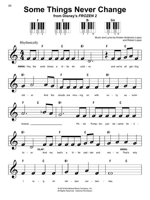 It's super easy! This series features accessible arrangements for piano, with simple right-hand melody, letter names inside each note, and basic left-hand chord diagrams. This edition includes 14 arrangements from Frozen and Frozen 2: All Is Found · Do You Want to Build a Snowman? · Fixer Upper · For the First Time in Forever · In Summer · Into the Unknown · Let It Go · Lost in the Woods · Love Is an Open Door · The Next Right Thing · Reindeer(s) Are Better Than People · Show Yourself · Some Things Never Change · When I Am Older.