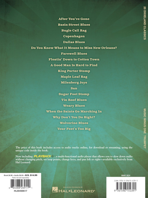 Twenty great Dixieland classics presented here in complete versions with trumpet great John Hoffman; then as backgrounds to your own performance with the Dixieland All-Stars. Contains printed music score and online audio files. Due to the improvisational nature of these compositions, two versions of each song have been provided - the first with the melody played straight, and the second with an improvised solo part. Those audio demos plus play-along tracks are all accessed online using the unique code inside each book and can be streamed or downloaded. The audio files include PLAYBACK+, a multi-functional audio player that allows you to slow down audio without changing pitch, set loop points, change keys, and pan left or right. Songs include: After You've Gone · Basin Street Blues · Do You Know What It Means to Miss New Orleans? · Maple Leaf Rag · Sugar Foot Stomp · When the Saints Go Marching In · Why Don't You Do Right? · and more. Performed by John Hoffman Accompaniment: Dixieland All-Stars: Nat Pierce, piano; Jim Dahl, trombone; Hal McKusick, clarinet; Russ Saunders, bass; Ted Sommer, drums