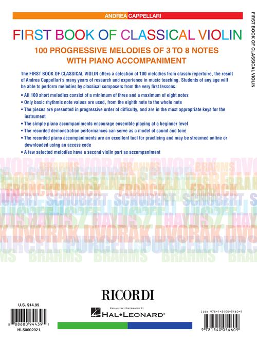 The First Book of Classical Violin offers a selection of 100 melodies from classic repertoire, the result of Andrea Cappellari's many years of research and experience in music teaching. Students of any age will be able to perform melodies by classical composers from the very first lessons. All 100 short melodies consist of a minimum of three and a maximum of eight notes. Only basic rhythmic note values are used, from the eighth note to the whole note. The pieces are presented in progressive order of difficulty, and are in the most appropriate keys for the instrument. The simple piano accompaniments encourage ensemble playing at a beginner level and the recorded piano accompaniments are an excellent tool for practicing. A few selected melodies also have a second violin part as part of the recorded accompaniment. The book also includes a separate instrumental pull-out part. Audio is accessed online using the unique code inside the book and can be streamed or downloaded. The audio files include PLAYBACK+, a multi-functional audio player that allows you to slow down audio without changing pitch, set loop points, change keys, and pan left or right.