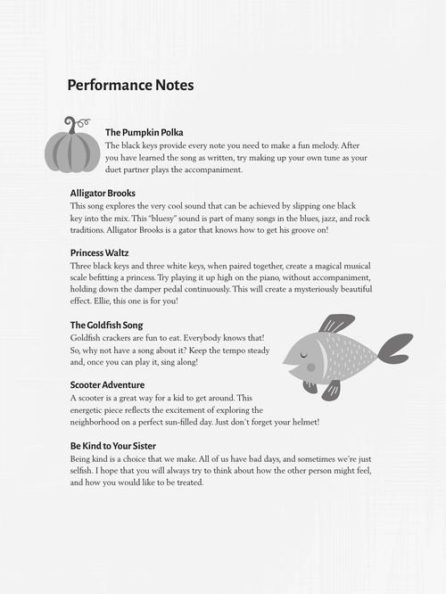 Transcrições para piano; incluindo: Alligator Brooks • Be Kind to Your Sister • The Chick Filet Song • The Goldfish Song • The PB & J Song • Please Be Patient • Princess Waltz • The Pumpkin Polka • Race Cars • Scooter Adventure.