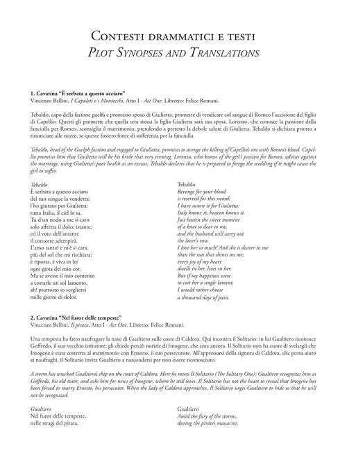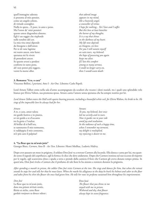 VINCENZO BELLINI I Capuleti e i Montecchi È serbata a questo acciaro • Il pirata Nel furor delle tempeste • I puritani A te, o cara • GEORGES BIZET Carmen La fleur que tu m'avais jetée • FRANCESCO CILEA L'Arlesiana È la solita storia del pastore... • GAETANO DONIZETTI Don Pasquale Com'è gentil • L'elisir d'amore Quanto è bella • Una furtiva lagrima • La favorita Favorita del re! - Spirto gentil • La fille du régiment Ah ! mes amis - Pour mon âme • Lucia di Lammermoor Tombe degli avi miei - Fra poco a me ricovero • Tu che a Dio spiegasti l'ali • UMBERTO GIORDANO Fedora Amor ti vieta • CHARLES GOUNOD Faust Salut ! demeure chaste et pure • GEORGE FRIDERIC HANDEL Alcina È un folle, è un vile affetto • EDOUARD LALO Le roi d'Ys Puisqu'on ne peut - Vainement, ma bien aimée • JULES MASSENET Manon C'est vrai...- En fermant les yeux o Je suis seul ! - Ah ! fuyez, douce image • Werther Toute mon âme - Pourquoi me réveiller • WOLFGANG AMADEUS MOZART Così fan tutte Un'aura amorosa • Don Giovanni Dalla sua pace • Il mio tesoro • Die Zauberflöte Dies Bildnis ist bezaubernd schön • GIACOMO PUCCINI La bohème Che gelida manina • La fanciulla del West Ch'ella mi creda • Gianni Schicchi Avete torto! - Firenze è comeun albero fiorito • Madama Butterfly Amore o grillo o Addio, fiorito asil • Manon Lescaut Donna non vidi mai • Tosca Recondita armonia • Turandot Nessun dorma! • GIOACHINO ROSSINI Il barbiere di Siviglia Ecco ridente in cielo o ente in cielo • La Cenerentola Sì, ritrovarla io giuro • Guglielmo Tell O muto asil del pianto • PYOTR IL'YICH TCHAIKOVSKY Eugene Onegin Kuda, kuda, kuda vy udalilis • GIUSEPPE VERDI Un ballo in maschera Di' tu se fedele • Rigoletto Questa o quella • Ella mi fu rapita! - Parmi veder le lagrime • La donna è mobile • La traviata Lunge da lei - Dei miei bollenti spiriti