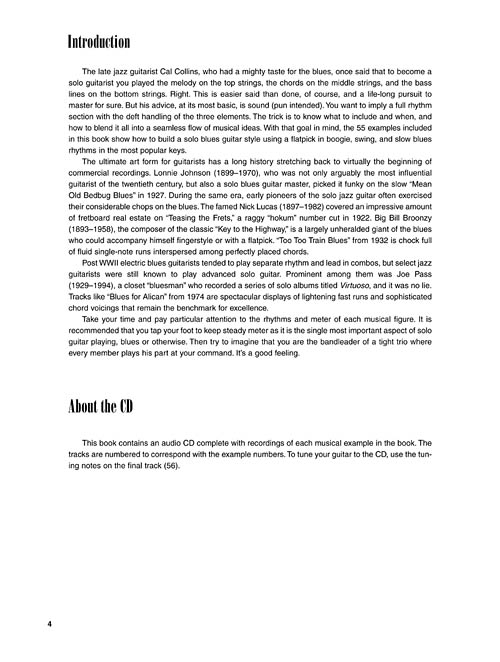 Este livro traz 55 arranjos de blues tradicional, além de riffs, licks e linhas melódicas. Várias formas de blues são apresentadas, como progressões de blues de 8 e 12 compassos, assim como padrões rítmicos de blues lento e menor. Audio Online com a demonstração de cada exemplo encontrado no livro.
