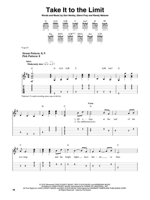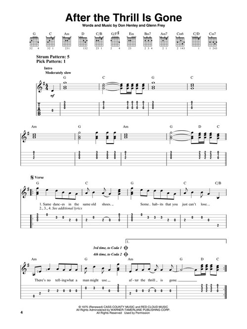 18 classic hits from the Eagles arranged for easy guitar with notes and tab and full lyrics.