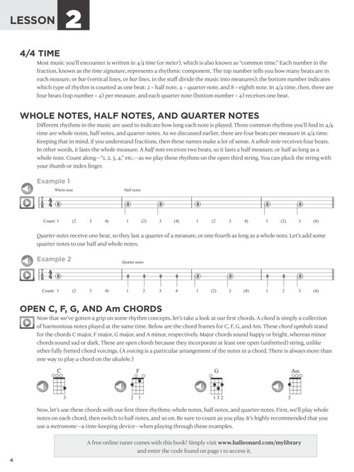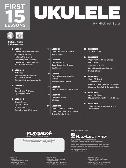 The First 15 Lessons series provides a step-by-step lesson plan for the absolute beginner, complete with audio tracks, video lessons, and real songs! Designed for self-teaching or for use with an instructor, you'll build a solid foundation as you work through each lesson, learning the basics of the instrument and music reading while practicing the many exercises, concepts and song excerpts within. Must-know instruction so you can start playing right away, with a free online tuner and metronome! This uke book features video and print lessons on: ukulele fundamentals; music reading; tuning; strumming; arpeggions; open and movable chords; fingerpicking; scales; syncopation; shuffle feel; and more. Strum and pluck along with popular songs including: