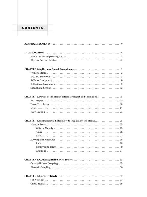 Write for a horn section! In this book, you will learn how to add saxophones and brass to a rhythm section ensemble. You will learn the capabilities and characteristics of the most common instruments, and how to order them effectively. You will also learn the different roles that a horn section can serve in your ensemble. Online audio tracks demonstrate the key concepts, as exemplified in a complete score.