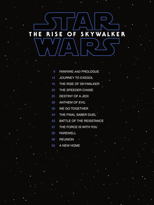 The Rise of Skywalker marca o último filme de Star Wars para o qual John Williams comporá a trilha. Esta coleção apresenta 13 arranjos fáceis para piano, aprovados pela Williams, da trilha sonora, incluindo: Anthem of Evil · Battle of the Resistance · Destiny of a Jedi · Fanfare and Prologue · Farewell · The Final Saber Duel · The Force Is with You · Journey to Exegol · A New Home · Reunion · The Rise of Skywalker · The Speeder Chase · We Go Together.