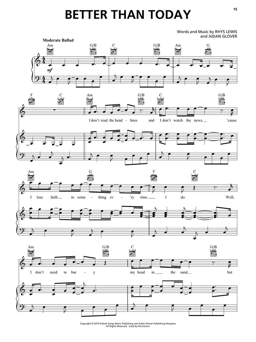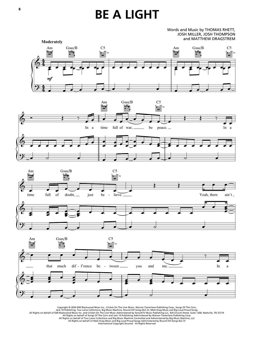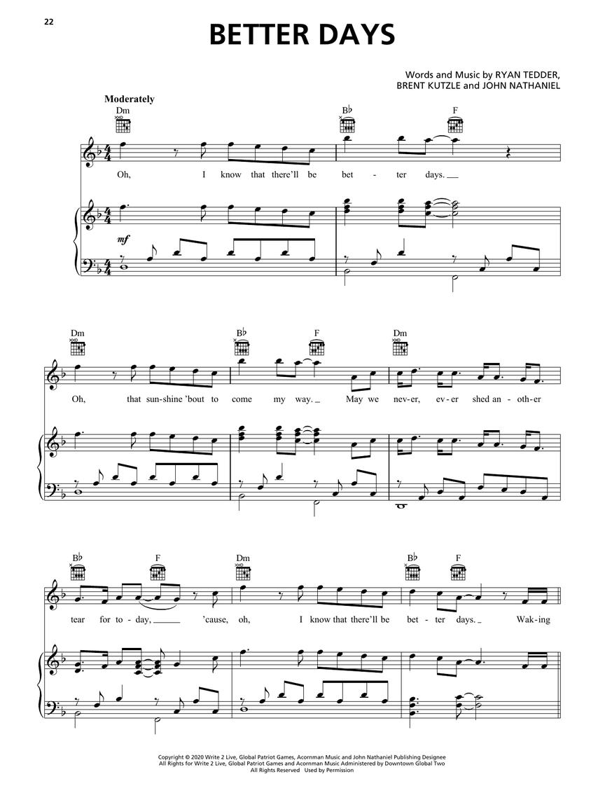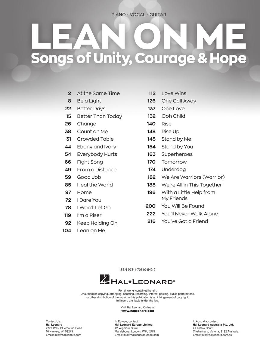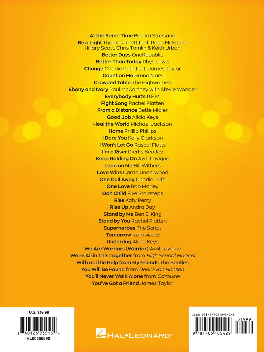 36 empowering selections, including: Better Days (OneRepublic) • Count on Me (Bruno Mars) • Fight Song (Rachel Platten) • Home (Phillip Phillips) • Lean on Me (Bill Withers) • Rise Up (Andra Day) • Underdog (Alicia Keys) • You Will Be Found (from Dear Evan Hansen) • You've Got a Friend (James Taylor) • and more.