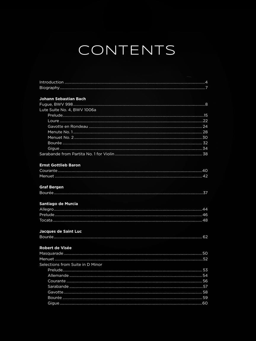 Coleção completa do melhor repertório do violão barroco. Esta coleção, com transcrições facilitadas, inclui seleções de Johann Sebastian Bach, Robert de Visée, Ernst Gottlieb Baron, Santiago de Murcia, Antonio Vivaldi, Sylvius Leopold Weiss e muito mais. Cada peça é escrita em notação padrão (sem tablatura) e inclui dedilhados essenciais da mão direita e esquerda.