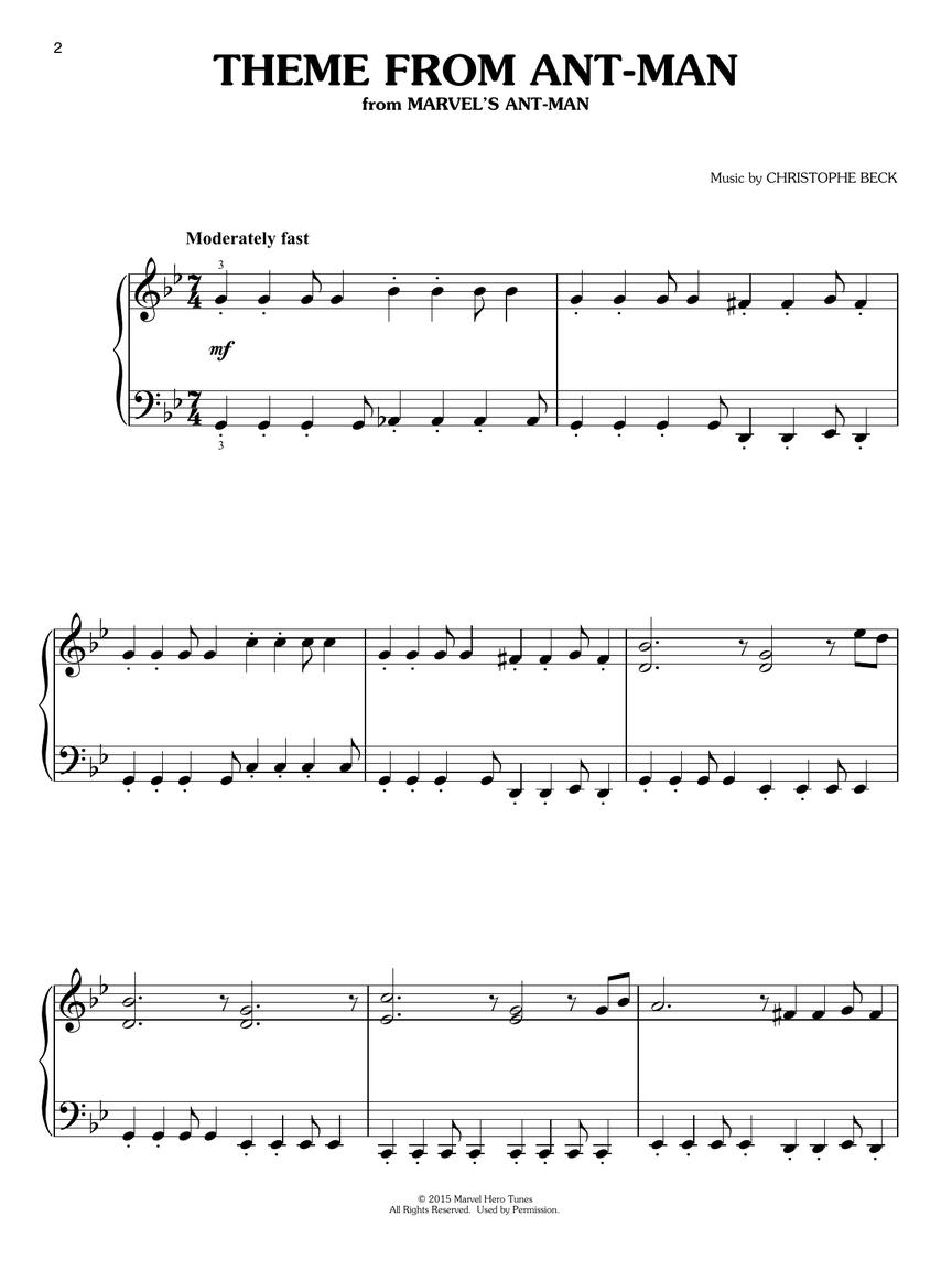 Don your cape and tickle the ivories with this heroic collection for easy piano, including: Theme from Ant-Man • Avengers Unite • Batman Theme • Captain America March • Elastigirl Is Back (from Incredibles 2) • Guardians Inferno (from Guardians of the Galaxy, Vol. 2) • Iron Man • Theme from Spider Man • Wakanda (from Black Panther) • and more.