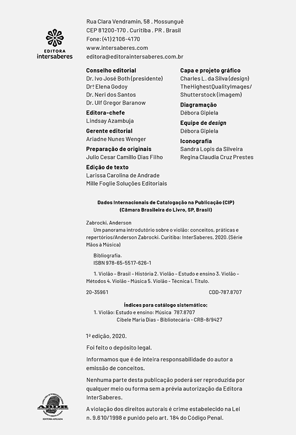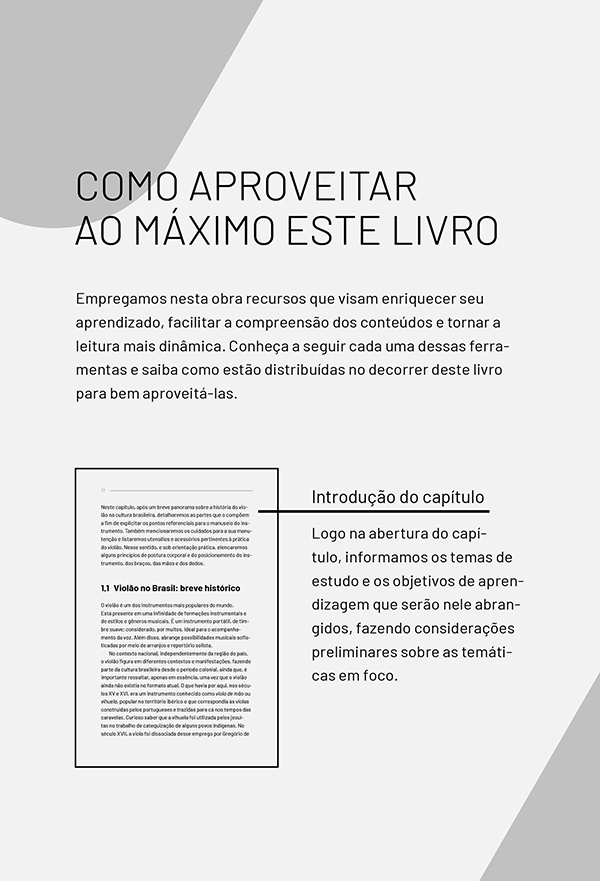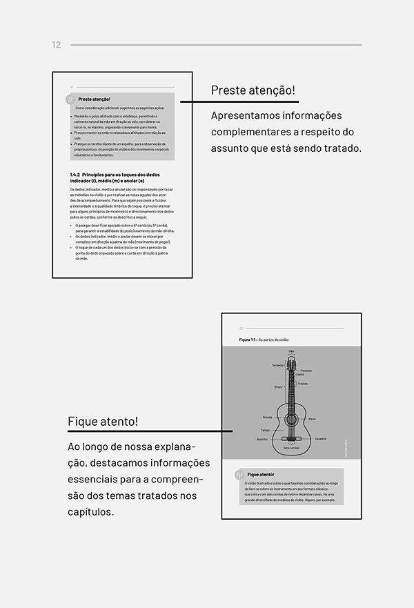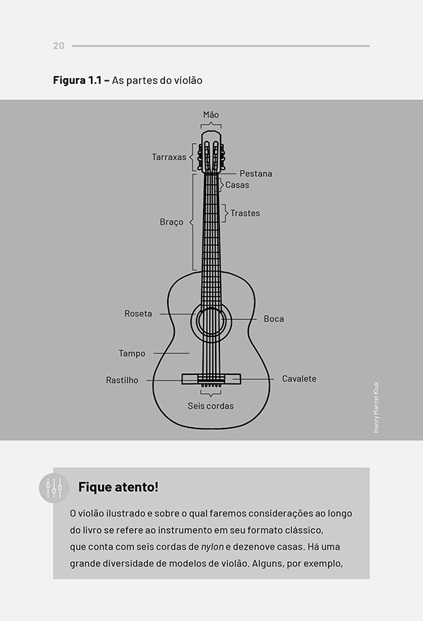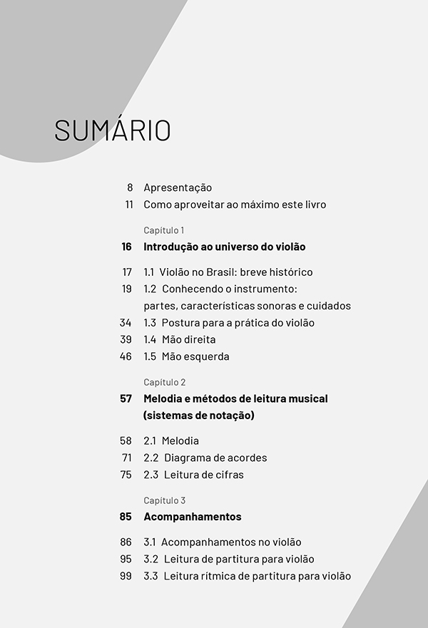 O violão é, sem dúvida, um dos instrumentos musicais mais populares na cultura brasileira. Por isso, não é raro que o primeiro contato com esse objeto seja em ambientes informais, entre familiares e amigos. Com isso, muitos aprendem a tocar violão “de ouvido”, sem necessariamente saber ler notações musicais, como as cifras. Contudo, dominar os principais elementos técnicos e formais do violão contribui para que o instrumentista alcance a maestria. Pensando nisso, esta obra apresenta os elementos teóricos e práticos que podem influenciar na destreza do violonista, como os princípios posturais que devem ser aplicados desde os estudos iniciais.