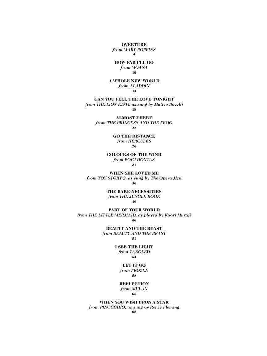 Todas as peças do álbum Disney Goes Classical apresentadas em versões clássicas de temas icônicos da Disney, arranjadas para piano solo e piano/vocal /violão quando apropriado. Incluindo: Almost There (from The Princess and the Frog) • The Bare Necessities (from The Jungle Book) • Beauty and the Beast • Can You Feel the Love Tonight? (from The Lion King) • Colors of the Wind (from Pocahontas) • Go the Distance (from Hercules) • How Far I'll Go (from Moana) • I See the Light (from Tangled) • Let It Go (from Frozen) • Overture from Mary Poppins • Part of Your World (from The Little Mermaid) • Reflection (from Mulan) • When She Loved Me (from Toy Story 2) • When You Wish Upon a Star (from Pinocchio) • A Whole New World (from Aladdin).