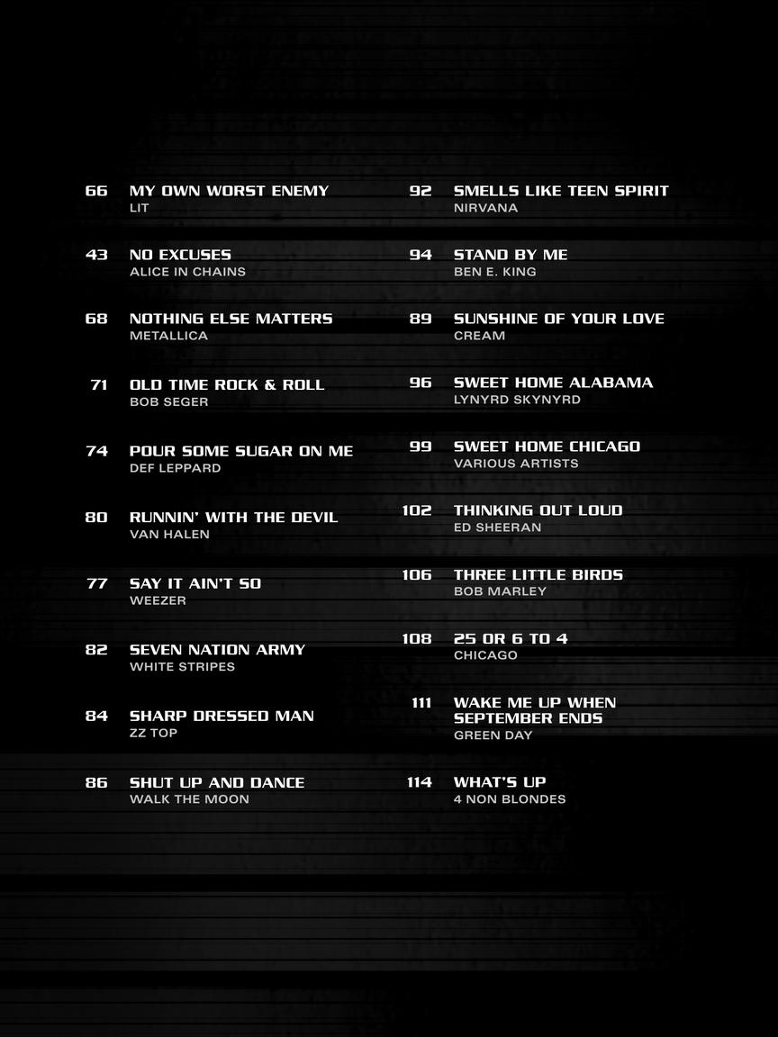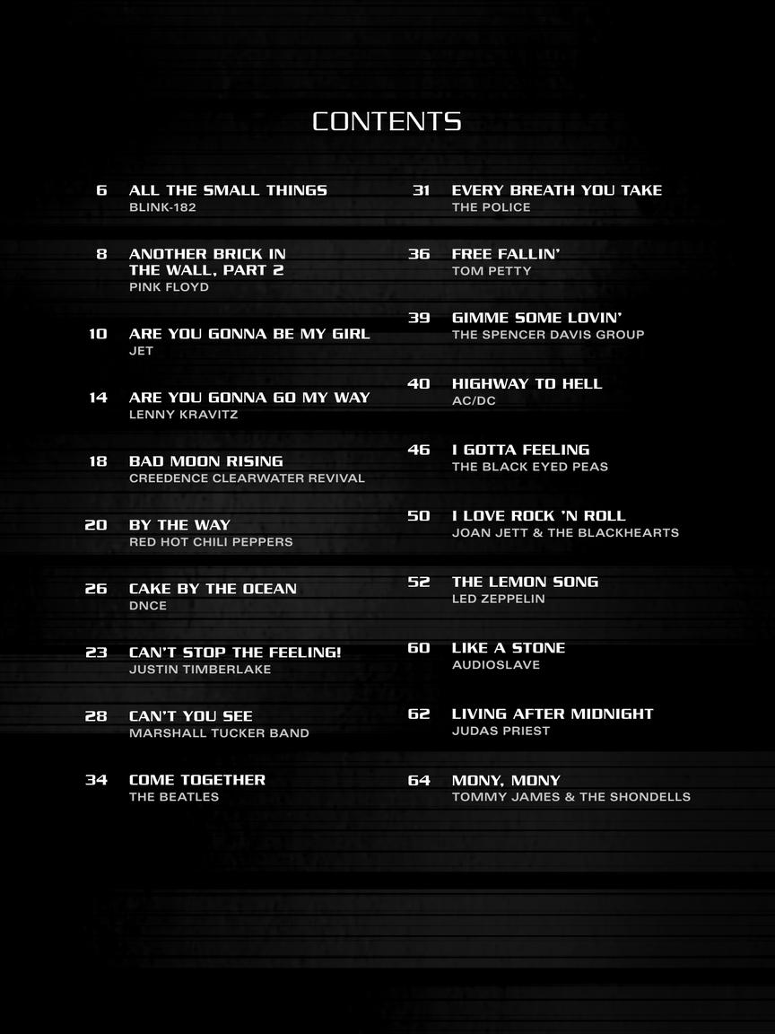Transcrições simplificadas de contrabaixo com uma combinação de tablatura, símbolos de acordes e letras de 40 canções populares; incluindo: Bad Moon Rising (Creedence Clearwater Revival) • Come Together (The Beatles) • Every Breath You Take (The Police) • Free Fallin' (Tom Petty) • I Love Rock 'N Roll (Joan Jett & The Blackhearts) • Living After Midnight (Judas Priest) • Pour Some Sugar on Me (Def Leppard) • Sharp Dressed Man (ZZ Top) • Smells like Teen Spirit (Nirvana) • Stand by Me (Ben E. King) • Wake Me Up When September Ends (Green Day) • e muitas outras!!!