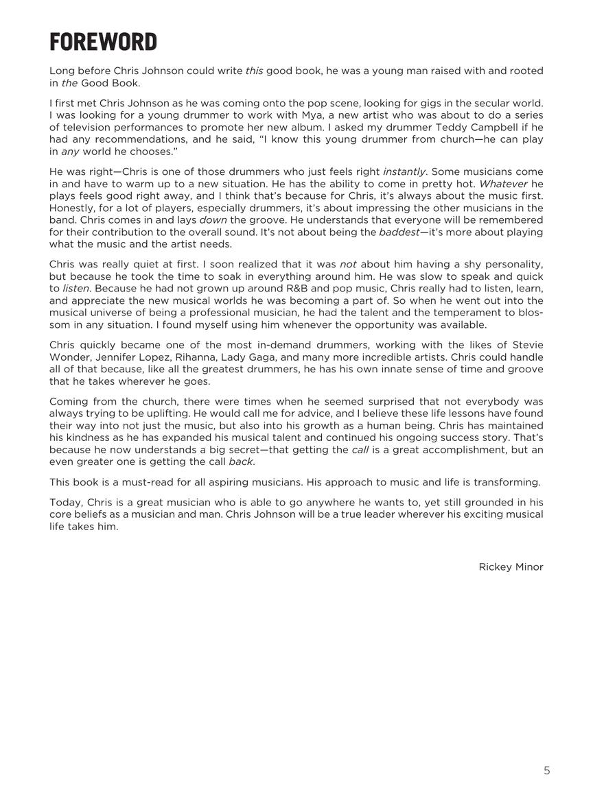 Welcome to your one-stop-shop for learning how tune your chops to pop, R&B, and gospel drumming! This unique book/video combo is the ultimate guide to developing grooves, improvisation, and technical mastery within modern music styles and settings. Chris Johnson has been one of the top in-demand drummers in the music industry for the last 20 years. His recording and touring credits range from pop icons such as Stevie Wonder, Madonna, Jennifer Lopez, Lady Gaga, and Rihanna to R&B singers Patti LaBelle, Mya, Lalah Hathaway, and Fantasia along with gospel artists Donnie McClurkin, Norman Hutchins, and Beverly Crawford. In this book, Chris gives advice for playing techniques and approaches, and sharing of experiences of playing in both live performances and studio sessions. In addition to Chris's insights and instruction, the accompanying videos and audio tracks showcase Chris playing to pop hits along with original music and arrangements played by his band. We've even included bonus material featuring interviews with other industry professionals! The three-plus hours of video content is accessed online using the unique code in each book.