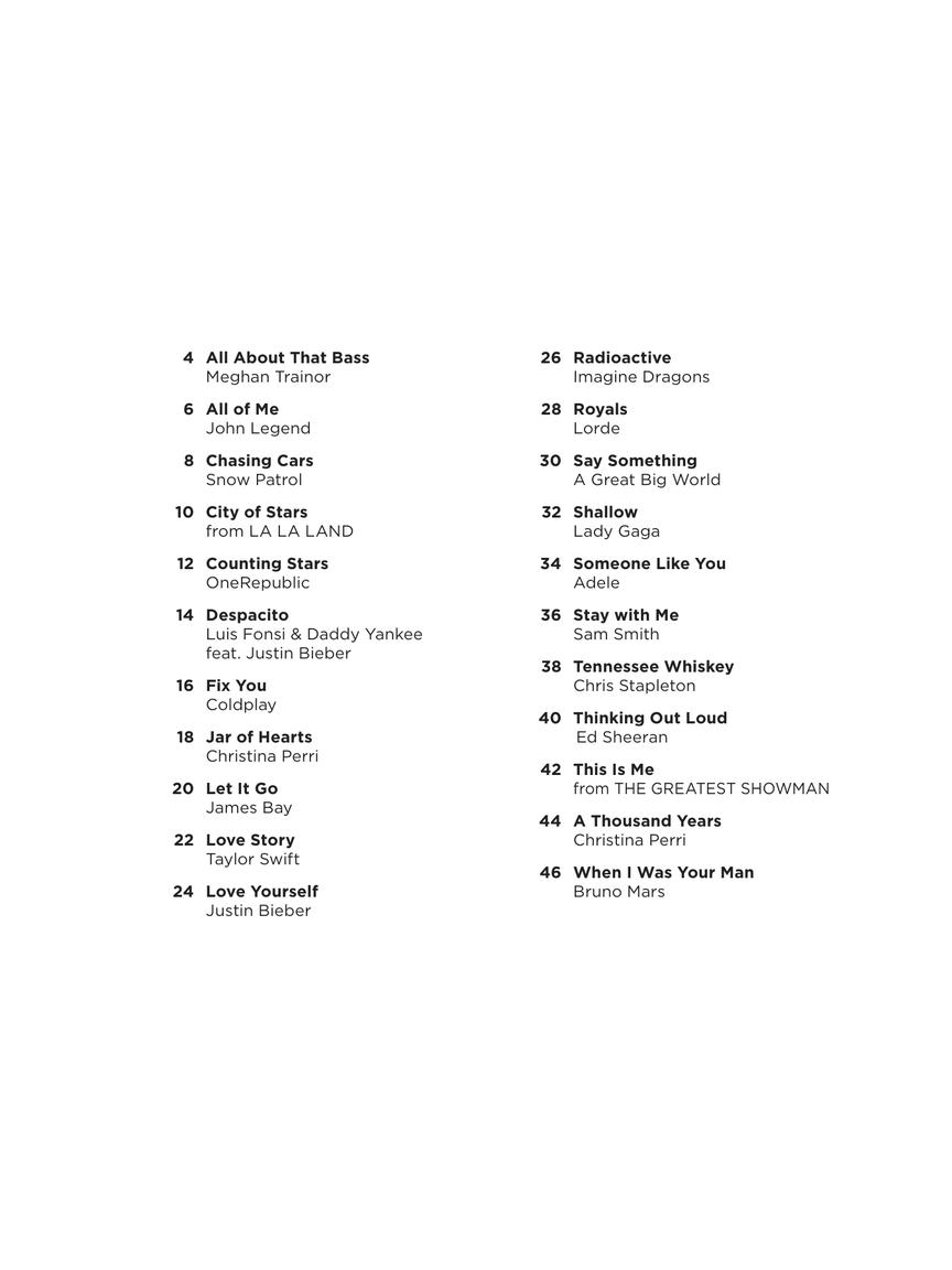 This songbook features easy-to-follow charts to get you playing right away! Each song is presented with chords, lyrics and basic tab to help even beginners play their favorite songs. This title features 22 hits, including: All About That Bass • All of Me • Despacito • Love Yourself • Royals • Say Something • Shallow • Someone like You • This Is Me • A Thousand Years • When I Was Your Man • and more.