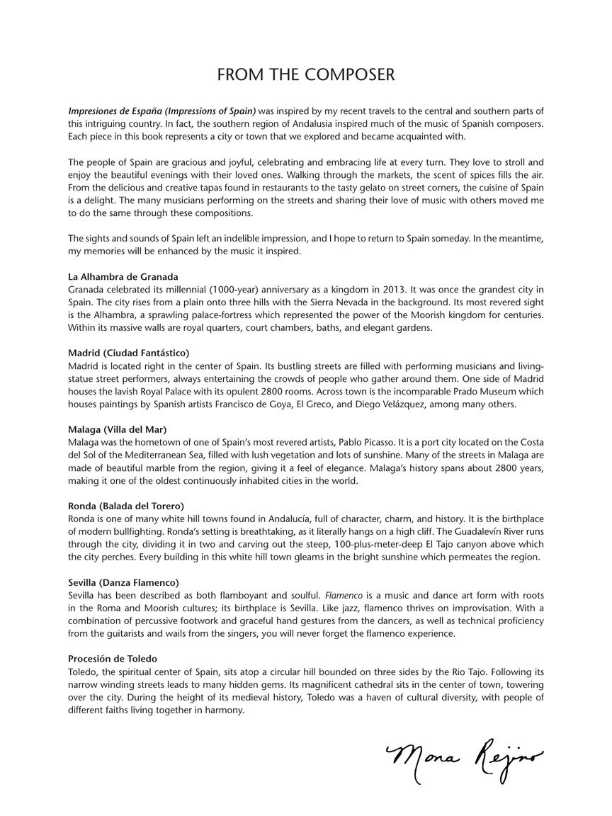6 gorgeous piano solos inspired by a recent trip to Spain! Each title represents a city Mona explored and became fond of. The sights and sounds of the country are beautifully conveyed in each harmony and rhythmic motif. Includes notes from the composer about each piece. Titles: Le Alhambra de Granada • Madrid (Ciudad Fantastico) • Malaga (Villa del Mar) • Ronda (Balada del Torero) • Sevilla (Danza Flamenco) • Procesion de Toledo.