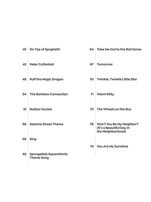 The Instant Piano Songs series will help you play your favorite songs quickly and easily - whether you use one hand or two! Start with the melody in your right hand, then add basic left-hand chords when you're ready. Letter names inside each note speed up the learning process, and optional rhythm patterns take your playing to the next level. Online backing tracks are also included. Stream or download the tracks using the unique codes inside each book, then play along to build confidence and sound great! This edition includes 30 songs kids love to play and sing, including: Do-Re-Mi · Hakuna Matata · It's a Small World · On Top of Spaghetti · Puff the Magic Dragon · The Rainbow Connection · SpongeBob SquarePants Theme Song · Take Me Out to the Ball Game · Tomorrow · The Wheels on the Bus · Won't You Be My Neighbor? (It's a Beautiful Day in the Neighborhood) · You Are My Sunshine · and more.