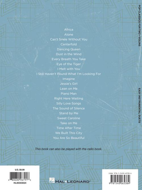 23 timeless hits in easy duet arrangements for two instrumentalists are featured in this collection, including: Africa · Every Breath You Take · I Still Haven't Found What I'm Looking For · Imagine · Jessie's Girl · The Sound of Silence · Sweet Caroline · and more. Arrangements work for two violins or can also be used with the cello title from this series.