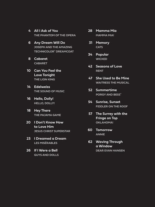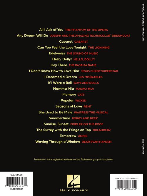 Esta coleção inclui 20 favoritos de palco em arranjos fáceis para guitarra, com notas e tab (e letras). As músicas incluem: All I Ask of You (from The Phantom of the Opera) · Cabaret · Edelweiss (from The Sound of Music) · Hello, Dolly! · I Dreamed a Dream (from Les Miserábles) · Memory (from Cats) · Popular (from Wicked) · Seasons of Love (from Rent) · Summertime (from Porgy and Bess) · Tomorrow (from Annie) · and more.
