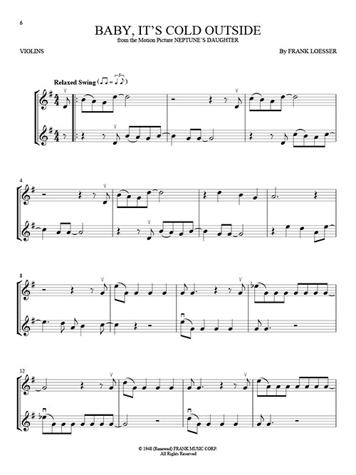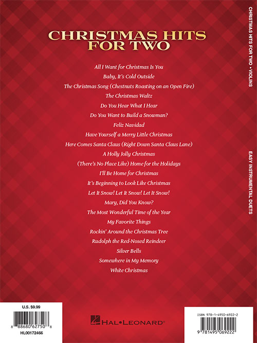 22 terrific holiday duets for instrumentalists are featured in this collection: All I Want for Christmas Is You · Baby, It's Cold Outside · The Christmas Song (Chestnuts Roasting on an Open Fire) · Do You Want to Build a Snowman? · Feliz Navidad · Have Yourself a Merry Little Christmas · It's Beginning to Look like Christmas · Let It Snow! Let It Snow! Let It Snow! · Mary, Did You Know? · Rockin' Around the Christmas Tree · Silver Bells · White Christmas · and more.