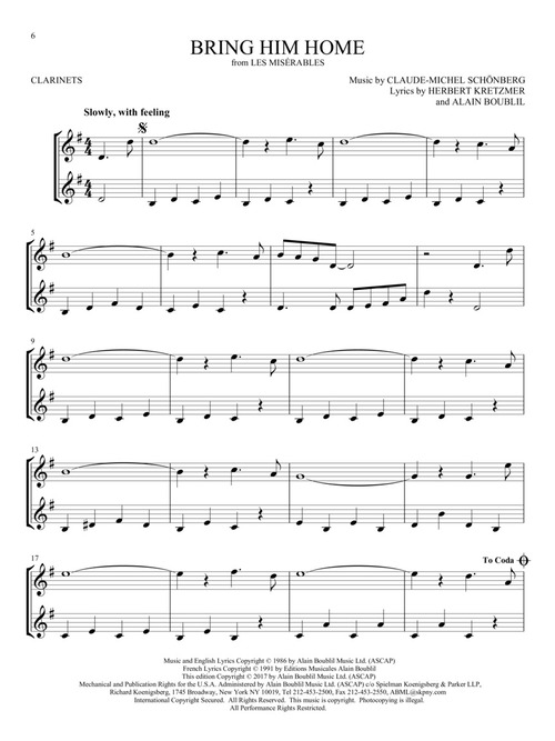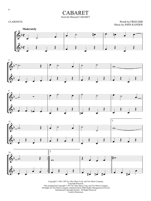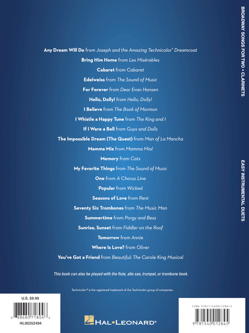 22 showstoppers in easy duet arrangements for two instrumentalists are featured in this collection, including: Any Dream Will Do · Bring Him Home · Cabaret · Edelweiss · For Forever · Hello, Dolly! · I Believe · Memory · One · Popular · Seasons of Love · Seventy Six Trombones · Tomorrow · Where Is Love? · You've Got a Friend · and more. Arrangements work for two clarinets or can also be used with the other woodwind or brass titles from this series.