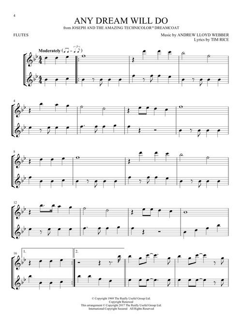 22 showstoppers in easy duet arrangements for two instrumentalists are featured in this collection, including: Any Dream Will Do · Bring Him Home · Cabaret · Edelweiss · For Forever · Hello, Dolly! · I Believe · Memory · One · Popular · Seasons of Love · Seventy Six Trombones · Tomorrow · Where Is Love? · You've Got a Friend · and more. Arrangements work for two flutes or can also be used with the other woodwind or brass titles from this series.
