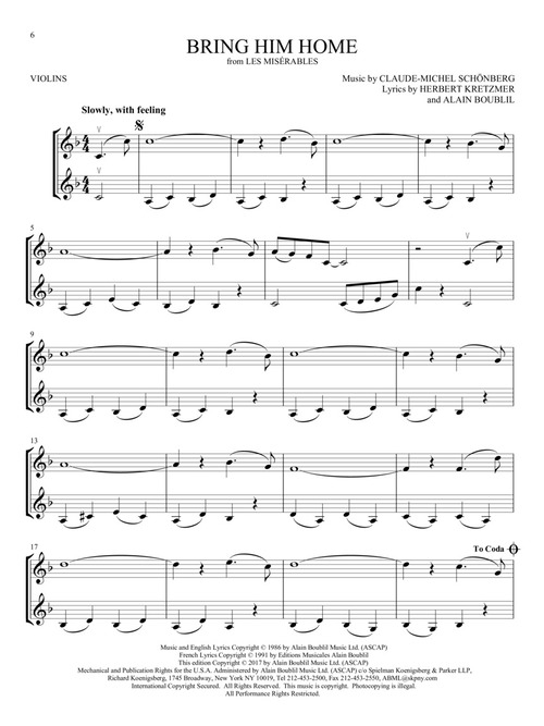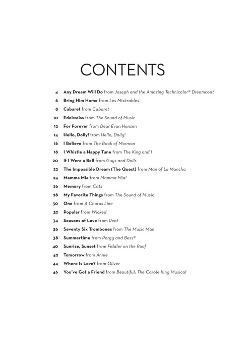 22 showstoppers in easy duet arrangements for two instrumentalists are featured in this collection, including: Any Dream Will Do · Bring Him Home · Cabaret · Edelweiss · For Forever · Hello, Dolly! · I Believe · Memory · One · Popular · Seasons of Love · Seventy Six Trombones · Tomorrow · Where Is Love? · You've Got a Friend · and more. Arrangements work for two violins or can be used with the other string titles from this series.