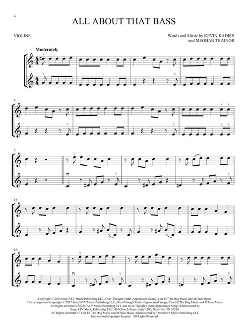 22 mega hits in easy duet arrangements for two instrumentalists are featured in this collection: All About That Bass · Brave · Can't Stop the Feeling · Grenade · Hey, Soul Sister · I Will Wait · Poker Face · Say Something · Shake It Off · Shape of You · Story of My Life · and more. Arrangements work for two violins or can be used with the other string titles from this series.