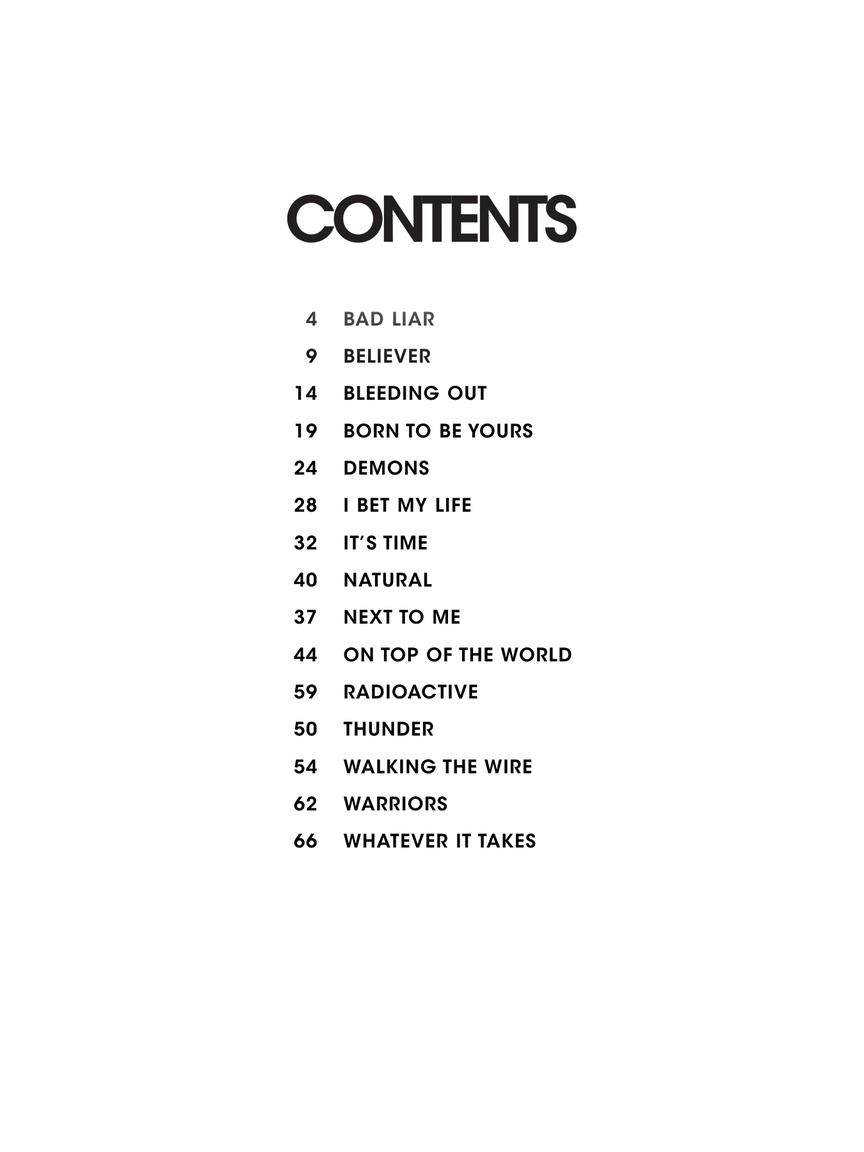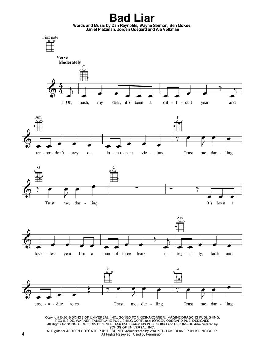 Now you can play the driving hits of Imagine Dragons on the uke! This collection features 15 songs arranged with melody, lyrics and chord diagrams for standard G-C-E-A tuning. Songs include: Bad Liar • Believer • Bleeding Out • Born to Be Yours • Demons • I Bet My Life • It's Time • Natural • Next to Me • On Top of the World • Radioactive • Thunder • Walking the Wire • Warriors • Whatever It Takes.