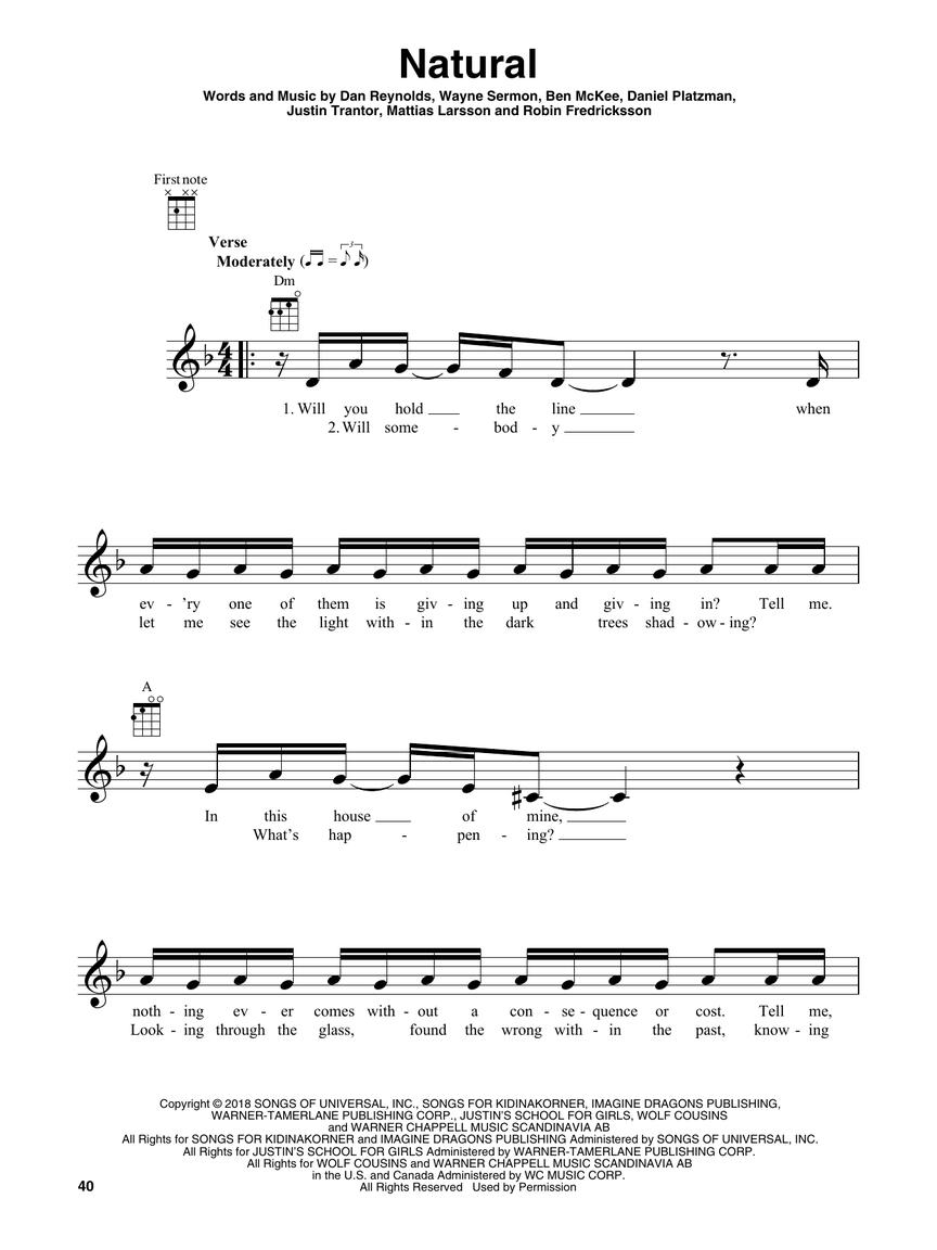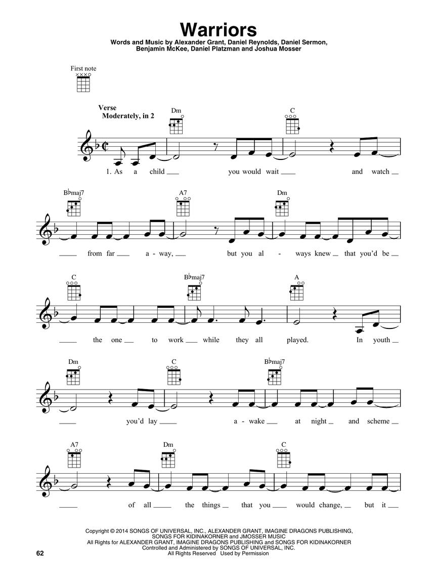 Now you can play the driving hits of Imagine Dragons on the uke! This collection features 15 songs arranged with melody, lyrics and chord diagrams for standard G-C-E-A tuning.