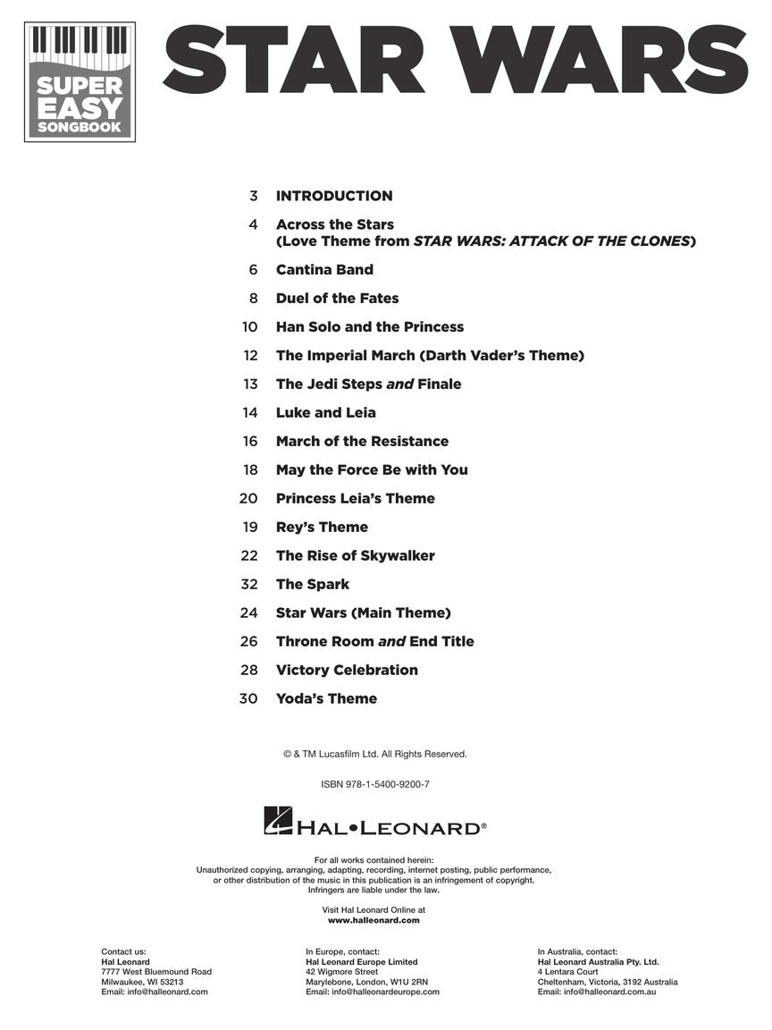 It's super easy! This series features accessible arrangements for piano, with simple right-hand melody, letter names inside each note, and basic left-hand chord diagrams. This edition includes 17 songs from the Star Wars franchise: Across the Stars • Cantina Band • The Imperial March (Darth Vader's Theme) • The Jedi Steps and Finale • Luke and Leia • Princess Leia's Theme • Rey's Theme • Star Wars (Main Theme) • and more.