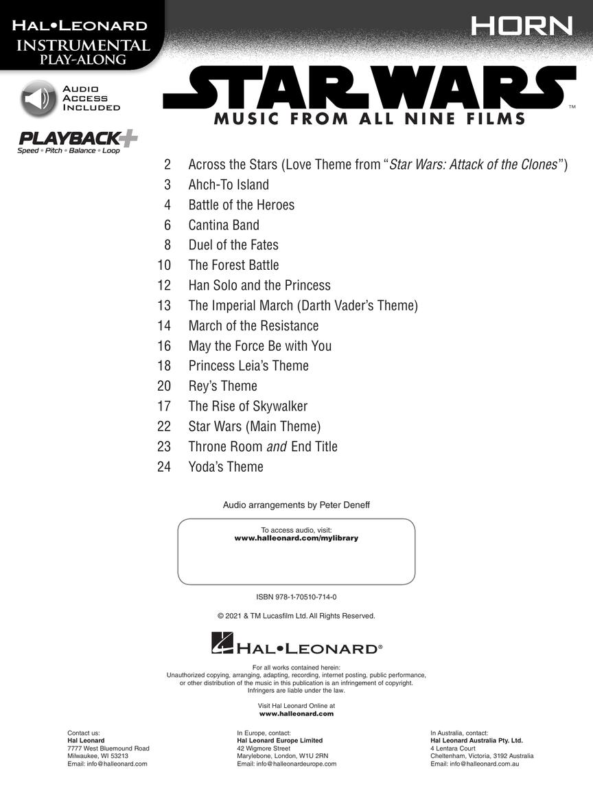 Play along with full accompaniments to your favorite Star Wars songs! This collection features solo arrangements of 16 favorite selections from all nine films in this epic series with excellent backing tracks that make you sound like a pro! Demonstration and backing tracks are provided for each song. Audio is accessed online using the unique code inside the book and can be streamed or downloaded. The audio files include PLAYBACK+, a multi-functional audio player that allows you to slow down audio without changing pitch, set loop points to master those challenging parts, change keys, and pan left or right. Includes: Across the Stars • Ahch-To Island • Battle of the Heroes • Duel of the Fates • The Forest Battle • The Imperial March (Darth Vader's Theme) • Rey's Theme • The Rise of Skywalker • Star Wars (Main Theme) • and more.