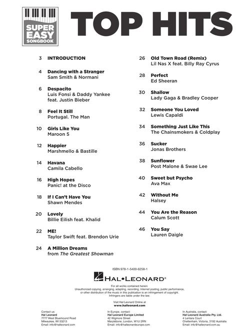 Arranjos superfacilitados para piano/teclado. Melodia simples para a mão direita e acordes básicos para a mão esquerda, além dos nomes das notas na partitura. Dancing with a Stranger (Sam Smith & Normani) • Girls like You (Maroon 5) • High Hopes (Panic! At the Disco) • A Million Dreams (from The Greatest Showman) (P!nk) • ME! (Taylor Swift feat. Brendon Urie) • Old Town Road [Remix] (Lil Nas X feat. Billy Ray Cyrus) • Perfect (Ed Sheeran) • Someone You Loved (Lewis Capaldi) • Sucker (Jonas Brothers) • Without Me (Halsey) • You Are the Reason (Calum Scott) • e outras.
