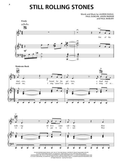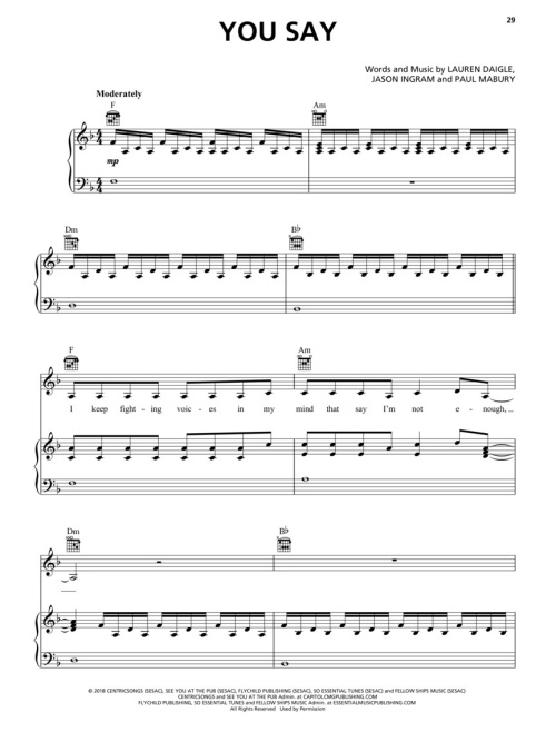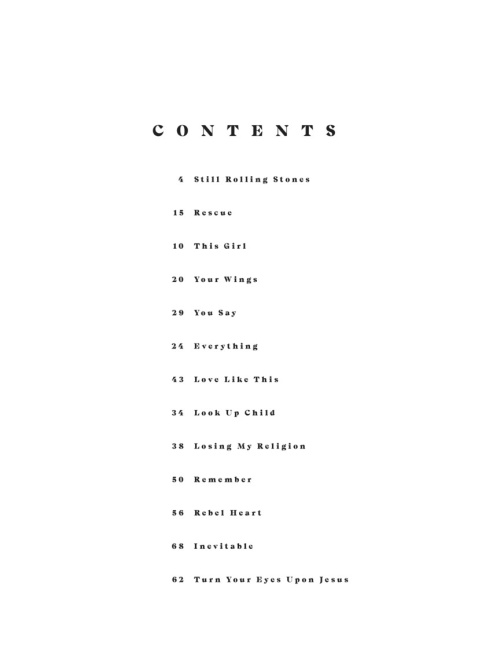 13 songs from this Dove Award-winning Christian music singer/songwriter's blockbuster 2018 album are presented in this folio for piano, voice and guitar. It features the lead single “You Say” plus: Everything • Inevitable • Love like This • Remember • Still Rolling Stones • Turn Your Eyes upon Jesus • Your Wings • and more.