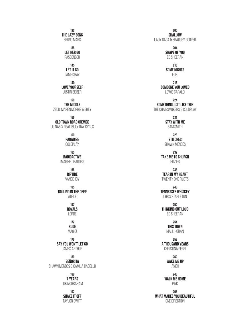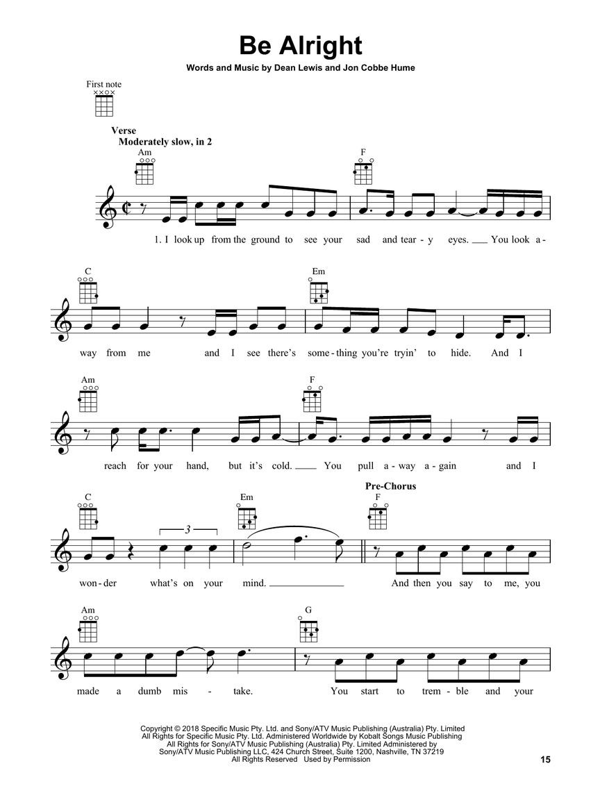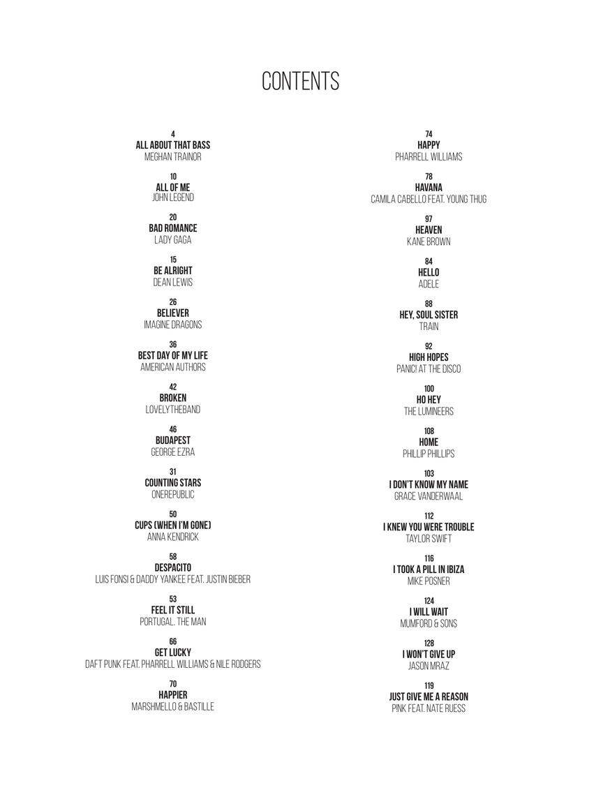 Os arranjos incluem melodia, letras e diagramas de acordes para a afinação de ukulele padrão GCEA. Inclui: All of Me (John Legend) • Believer (Imagine Dragons) • Despacito (Luis Fonsi & Daddy Yankee) • Get Lucky (Daft Punk) • Happy (Pharrell Williams) • Hey, Soul Sister (Train) • Ho Hey (The Lumineers) • I Will Wait (Mumford & Sons) • The Lazy Song (Bruno Mars) • Rolling in the Deep (Adele) • Shake It Off (Taylor Swift) • Shallow (Lady Gaga & Bradley Cooper) • Stay with Me (Sam Smith) • Thinking Out Loud (Ed Sheeran) • Wake Me Up (Avicii) • e outras.
