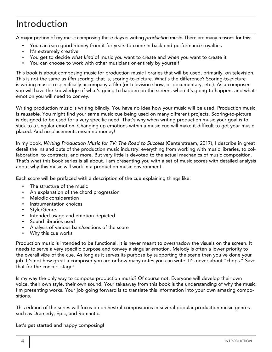 Here is a peek behind the curtains, revealing the secrets to writing successful orchestral instrumental music cues for the production music market. The reader is presented with several music cues to study and learn from. Through detailed analysis you will view complete transcriptions and hear the audio (online) of orchestral cues in multiple genres and styles. You will then have a better understanding of the structure of the music, why it works and how you can apply these tips to your own compositions. A valuable resource for anyone interested in creating production music for film and TV.