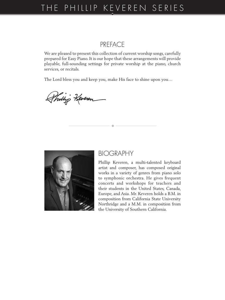 Students or church pianists will love playing these easy sacred solos in a contemporary church setting. All piano arrangements by the inimitable Phillip Keveren. Songs include: The Blessing • His Mercy Is More • King of My Heart • Living Hope • Lord, I Need You • Reckless Love • What a Beautiful Name • Who You Say I Am • and more.