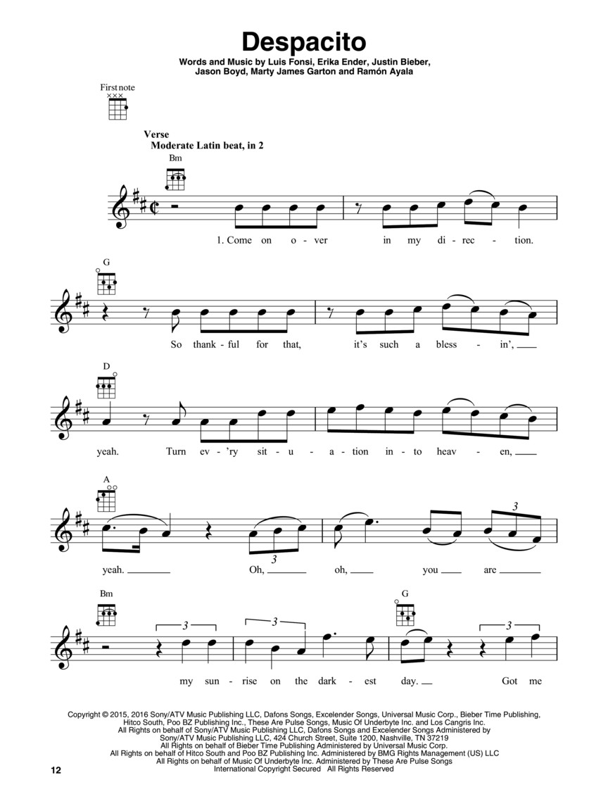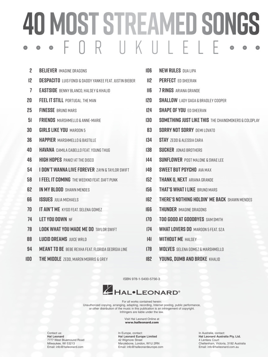 40 hits que soam ótimos no uke! Inclui: Despacito • Feel It Still • Girls like You • Happier • Havana • High Hopes • The Middle • Perfect • 7 Rings • Shallow • Shape of You • Something Just like This • Stay • Sucker • Sunflower • Sweet but Psycho • Thank U, Next • There's Nothing Holdin' Me Back • Without Me • and more!
