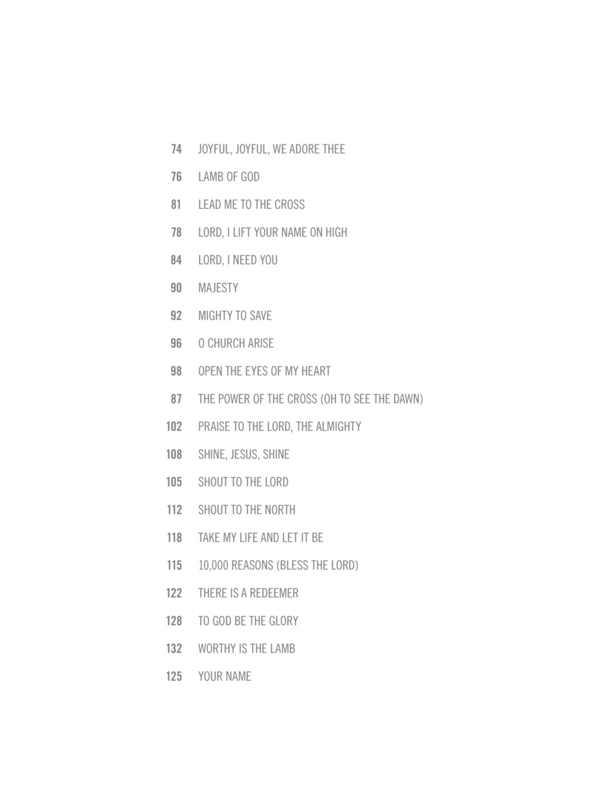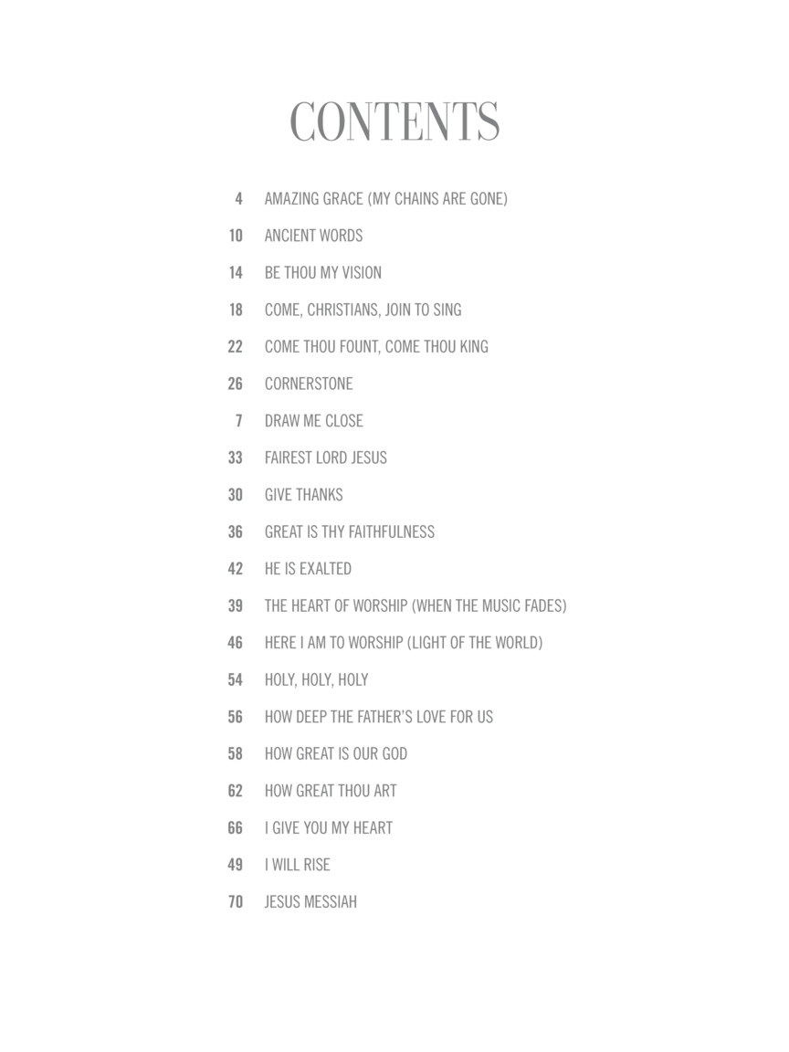 40 versatile arrangements which will fit well into a variety of worship settings are presented in this collection for piano solo. Songs include: Amazing Grace (My Chains Are Gone) • Be Thou My Vision • Cornerstone • Fairest Lord Jesus • Great Is Thy Faithfulness • How Great Is Our God • I Will Rise • Joyful, Joyful, We Adore Thee • Lamb of God • Majesty • Open the Eyes of My Heart • Praise to the Lord, the Almighty • Shout to the Lord • 10,000 Reasons (Bless the Lord) • Worthy Is the Lamb • Your Name • and more.