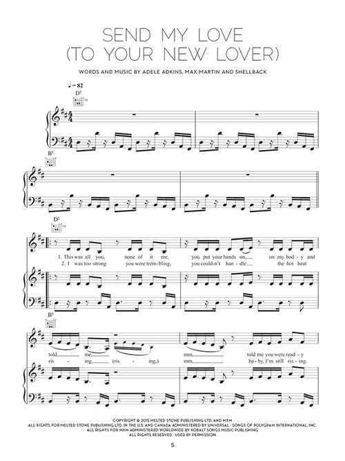 Transcrições para piano/vocal e acordes para violão. All I Ask • I Miss You • Million Years Ago • River Lea • Send My Love (To Your New Lover) • Water Under the Bridge • When We Were Young • Hello • e outras!!!