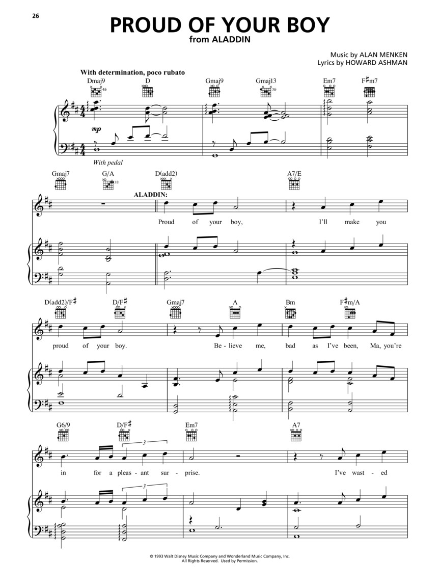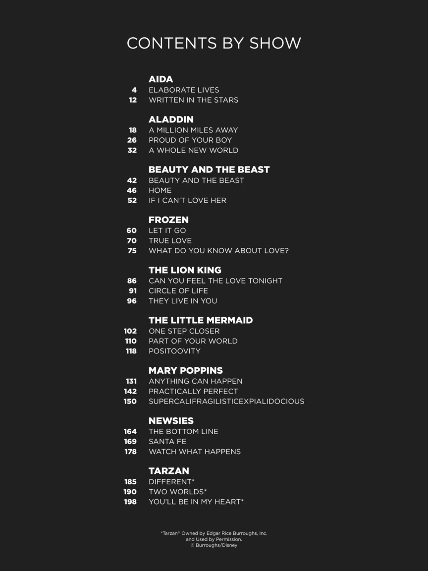 26 songs from nine Disney movie musicals which have been adapted into Broadway blockbusters are included in this updated 2nd edition songbook for piano, voice and guitar. Songs include: Written in the Stars (from Aïda) • Proud of Your Boy (from Aladdin) • If I Can't Love Her (from Beauty and the Beast) • True Love (from Frozen) • They Live in You (from The Lion King) • One Step Closer (from The Little Mermaid) • Anything Can Happen (from Mary Poppins) • Watch What Happens (from Newsies) • Two Worlds (from Tarzan) • and many more.