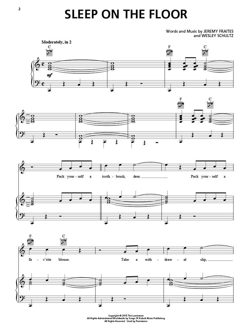 This long-awaited sophomore album release by the Lumineers topped the Billboard® album charts. Our songbook features 14 songs blending country, folk and pop styles in arrangements for piano, voice and guitar. Includes: Angela • Cleopatra • Gale Song • In the Light • Long Way from Home • My Eyes • Ophelia • Patience • Sleep on the Floor • and more.