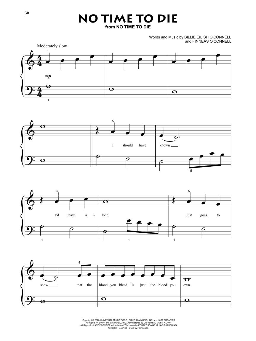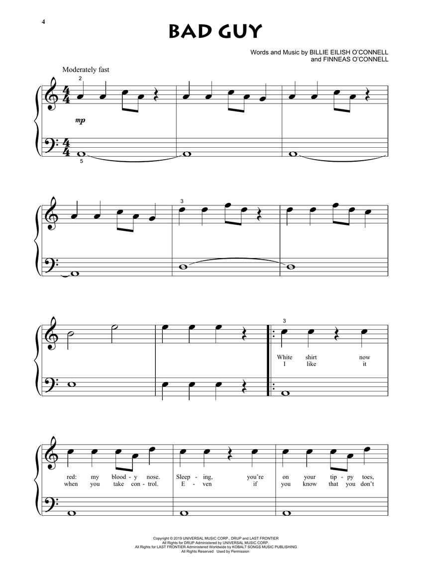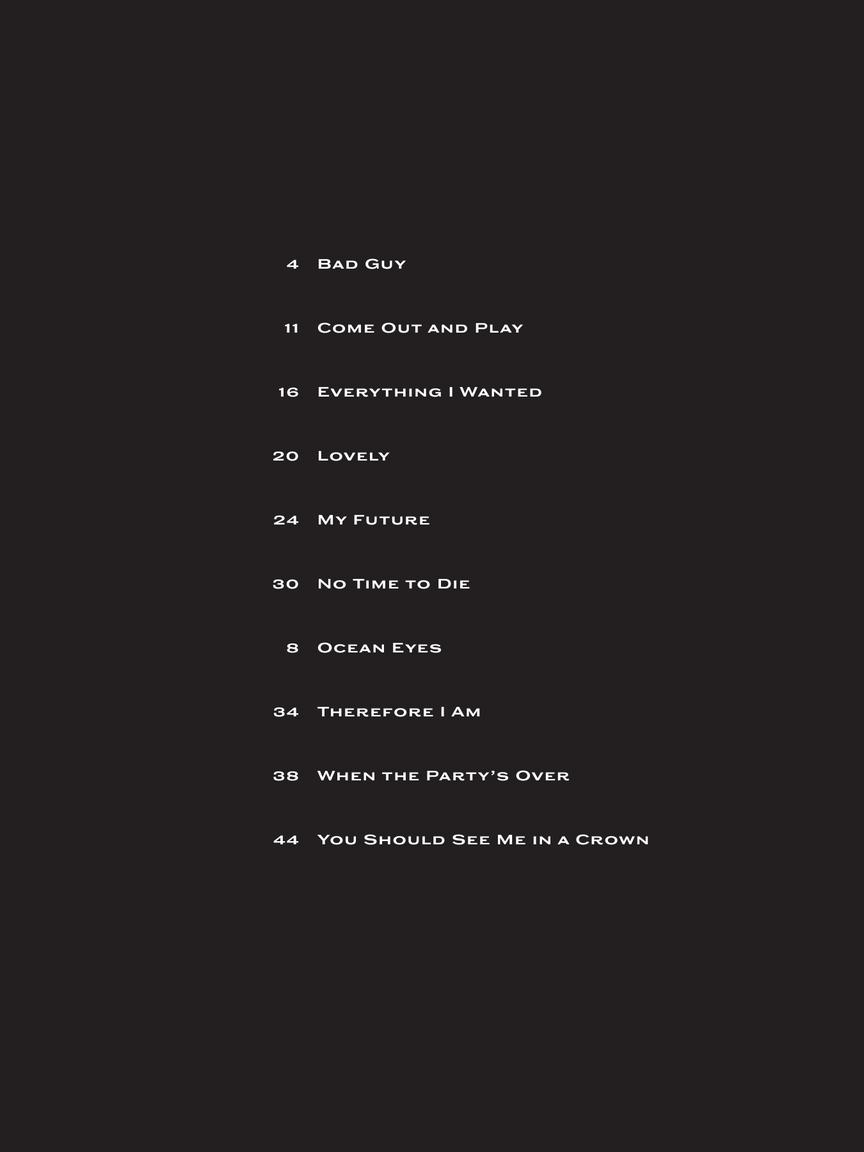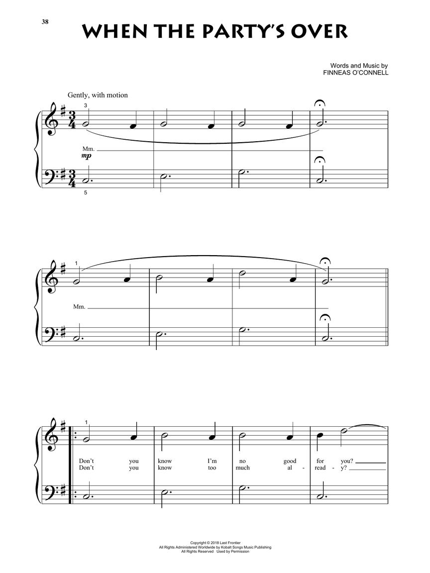 Ten favorites from pop superstar Billie Eilish in arrangements for beginning piano solo complete with lyrics–perfect for first and second-year piano students. Songs include: Bad Guy • Come Out and Play • Everything I Wanted • Lovely • My Future • No Time to Die • Ocean Eyes • Therefore I Am • When the Party's Over • You Should See Me in a Crown.