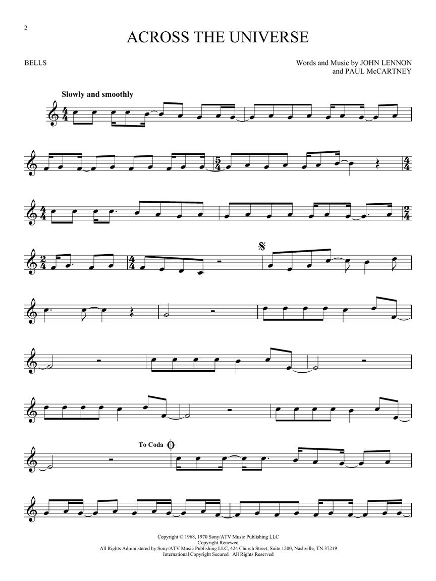 Sixty Fab Four favorites for bells/glockenspiel are included in this collection: All You Need Is Love • Blackbird • Can't Buy Me Love • Day Tripper • Eleanor Rigby • Here Comes the Sun • Hey Jude • I Want to Hold Your Hand • Let It Be • Ob-La-Di, Ob-La-Da • Penny Lane • She Loves You • Twist and Shout • When I'm Sixty-Four • Yesterday • and more.
