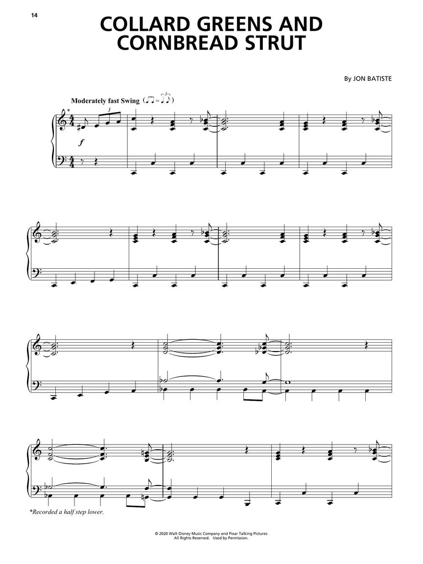 Our souvenir songbook features thirteen tunes from the music featured in and inspired by the 2020 Disney/Pixar release Soul featuring Jamie Foxx as a middle school band teacher in the lead role. This collection includes seven piano solo selections as performed in the movie by Jon Batiste, four jazz classics that served as inspiration, and piano/vocal/guitar arrangements of “It's All Right” and “Parting Ways.” It also includes seven pages of full-color scenes from the movie.