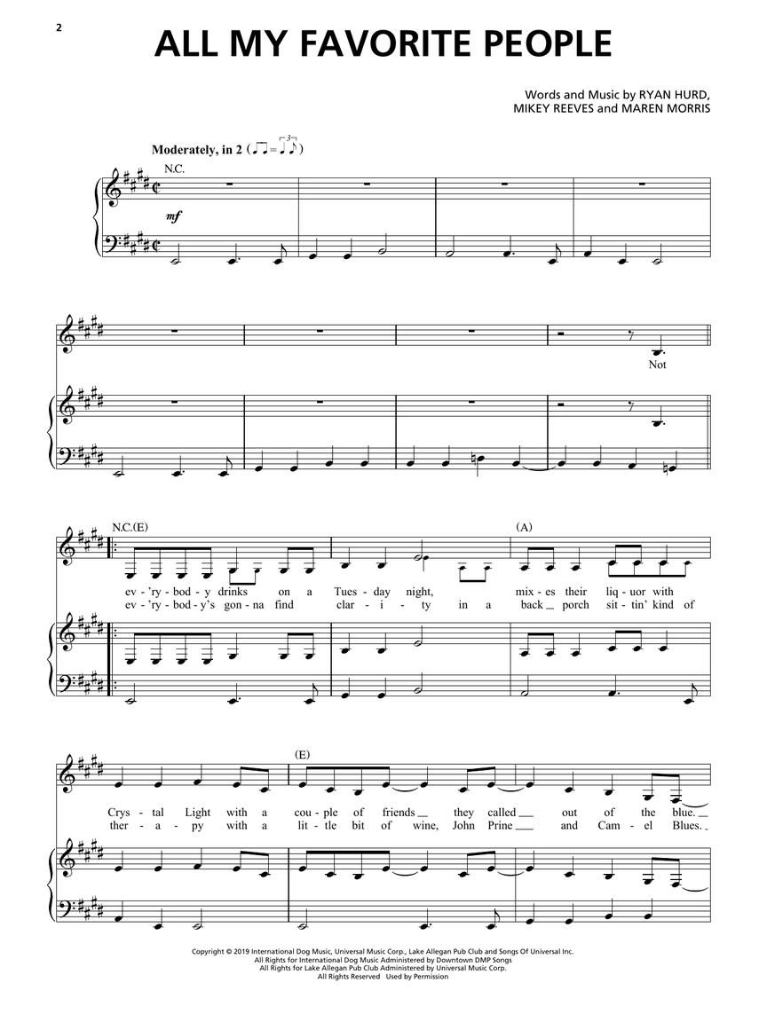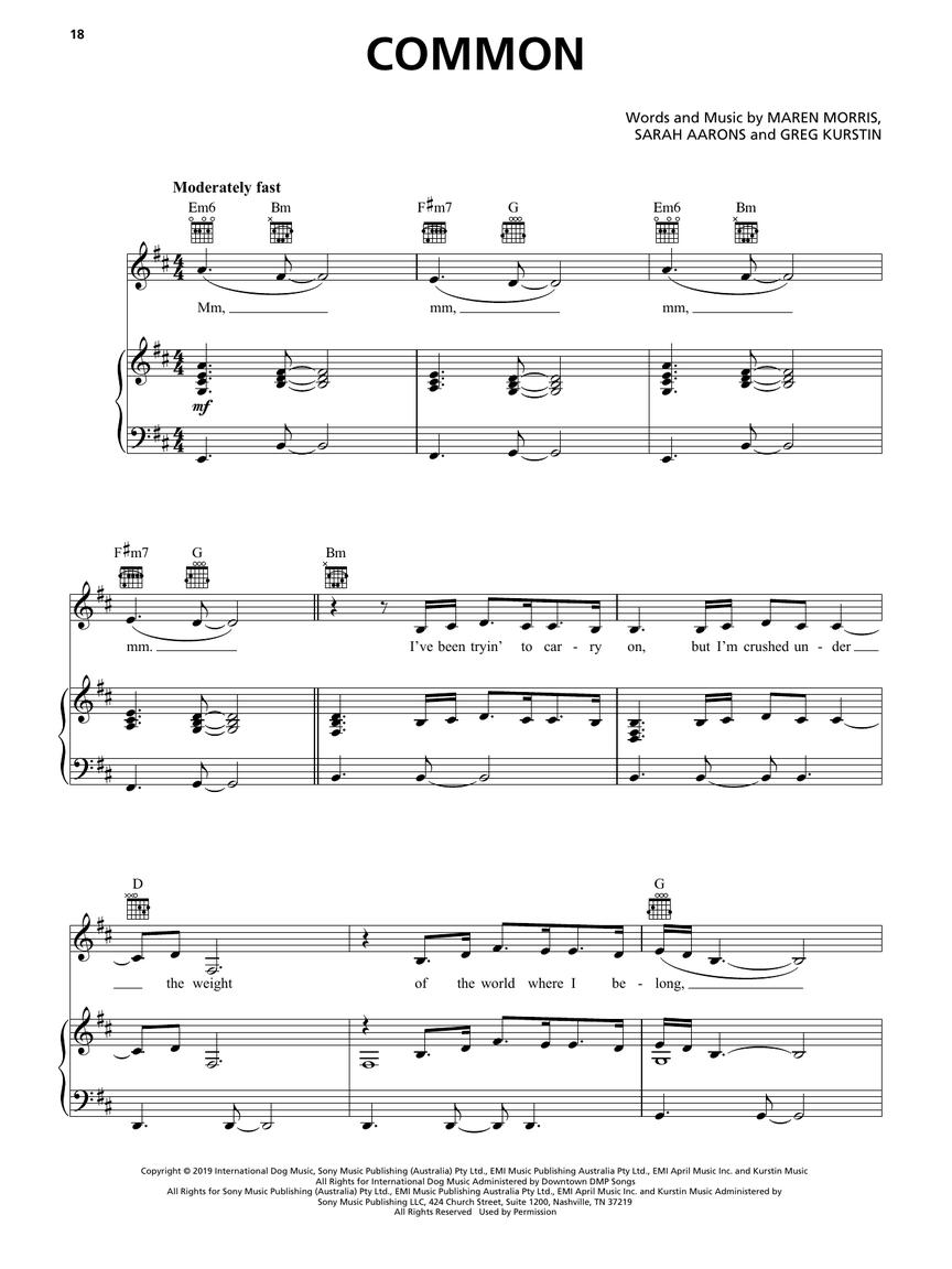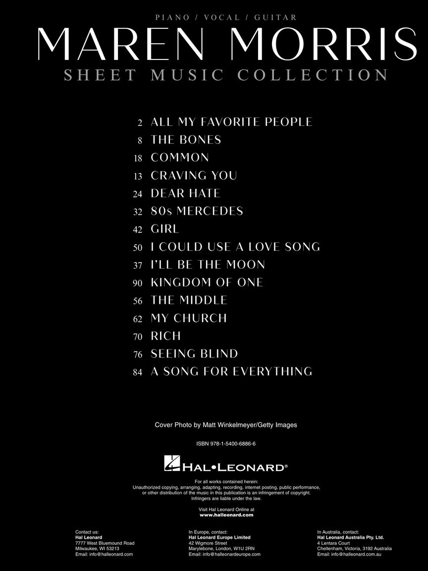 15 songs from the 2021 ACM Award winner for Female Artist of the Year. Our collection features 15 arrangements for piano, voice, and guitar with chord symbols, guitar frames, and full lyrics from her first two albums and her collaborations with Niall Horan, Dierks Bentley, Zedd, and others! Includes: The Bones • Craving You • Dear Hate • 80s Mercedes • Girl • I Could Use a Love Song • The Middle • My Church • Rich • A Song for Everything • and more.