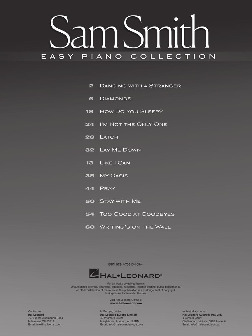 This songbook features a dozen hits arranged for easy piano with lyrics from the first three albums from Sam Smith. Includes: Dancing with a Stranger • Diamonds • How Do You Sleep? • I'm Not the Only One • Latch • Lay Me Down • Like I Can • My Oasis • Pray • Stay with Me • Too Good at Goodbyes • Writing's on the Wall.